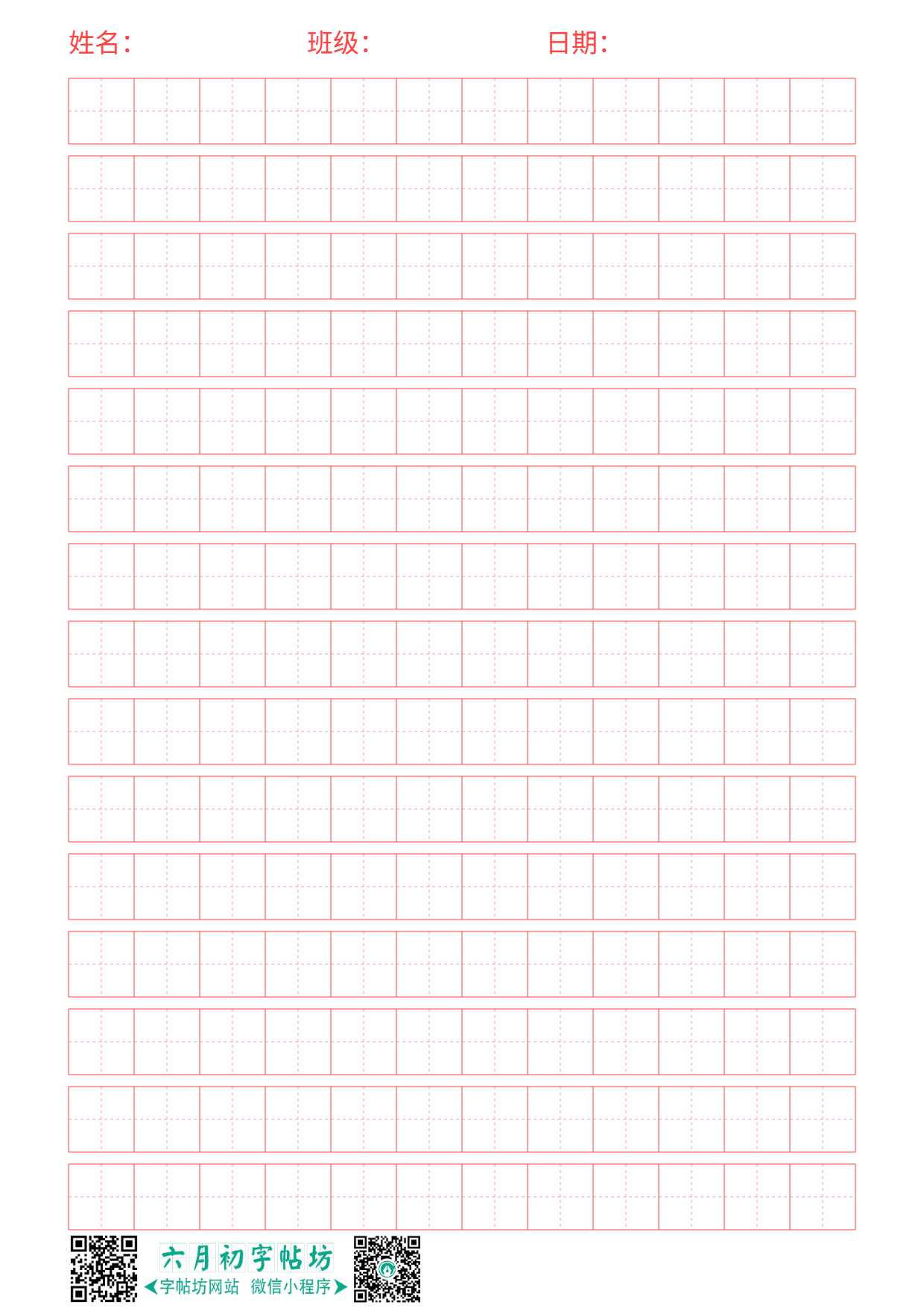 六月初字帖坊(zi.xuexiareas.cn)是博主自己独立开发的各类字帖生成网站,里面不单单包含田字格还有如米字格、回宫格、九宫格等多达16中字帖模板的网站。同时也支持微信小程序,搜索“六月初字帖坊”,免费下载各类字帖模板。